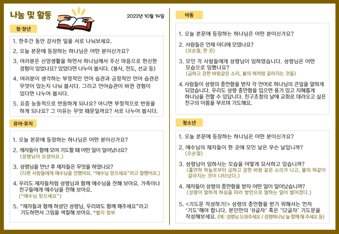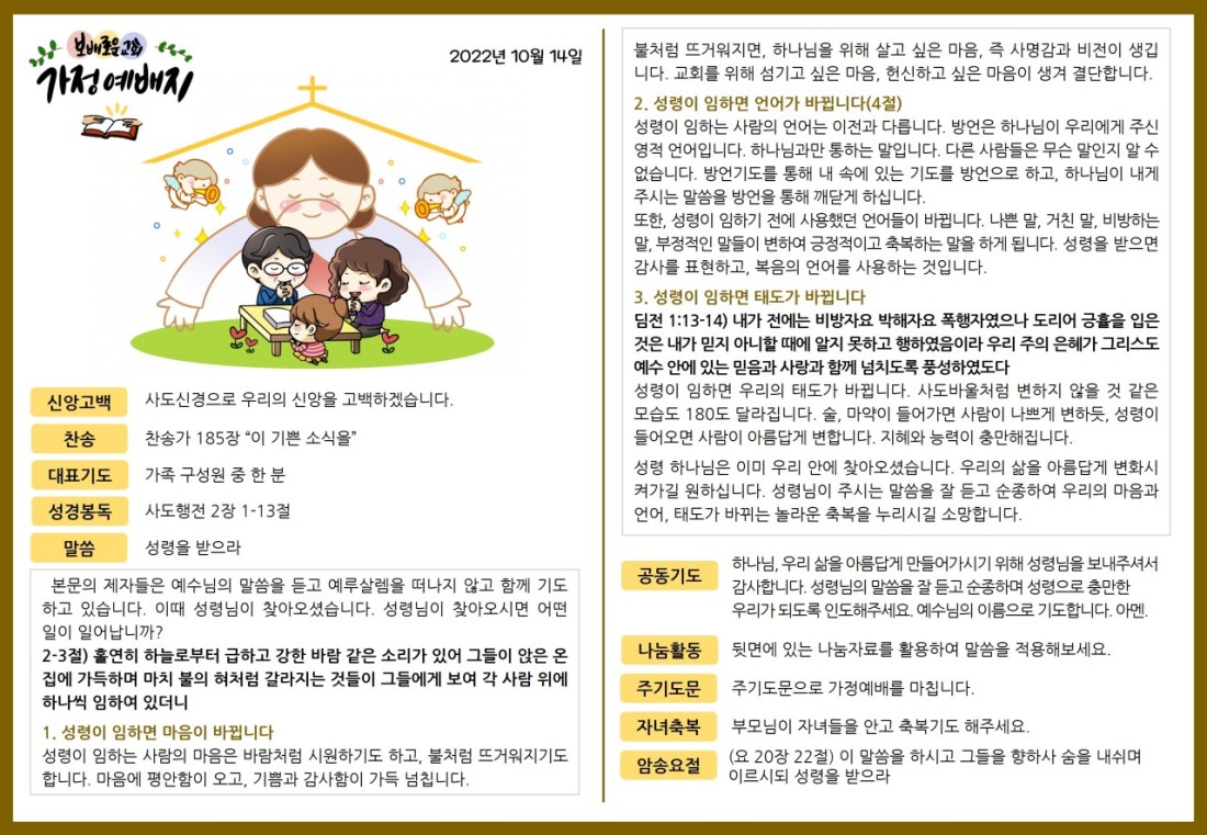 2022. 10. 14. 가정예배지 페이지 정보 조회Hit 325회 작성일Date 22-12-28 15:06 본문 목록 이전글 2022. 10. 21. 가정예배지 22.12.28 다음글2022. 10. 7. 가정예배지 22.10.05
