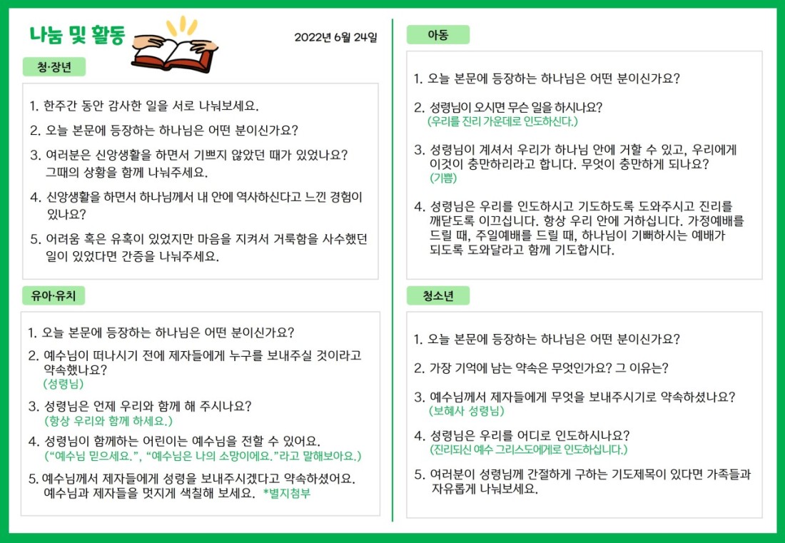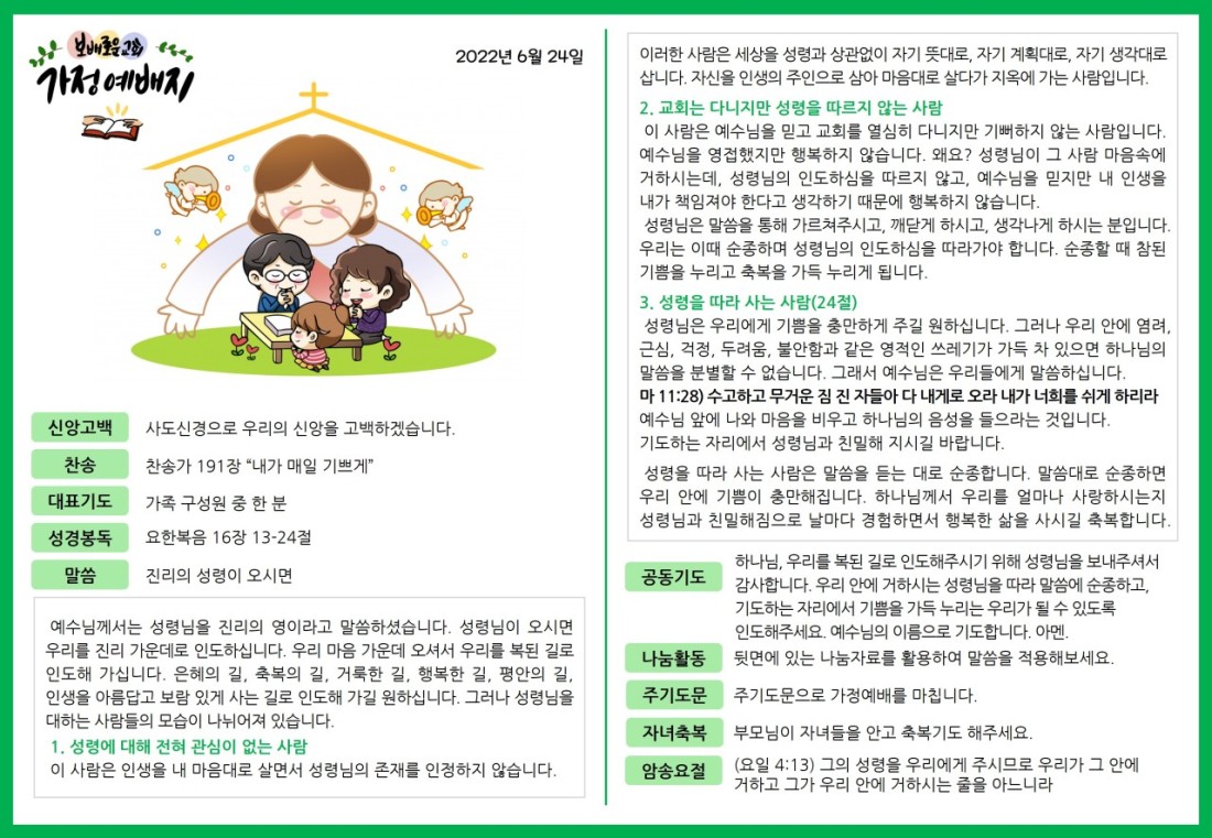 2022. 6. 24. 가정예배지 페이지 정보 조회Hit 340회 작성일Date 22-06-22 11:38 본문 목록 이전글2022. 7. 1. 가정예배지 22.06.28 다음글2022. 6. 17. 가정예배지 22.06.22