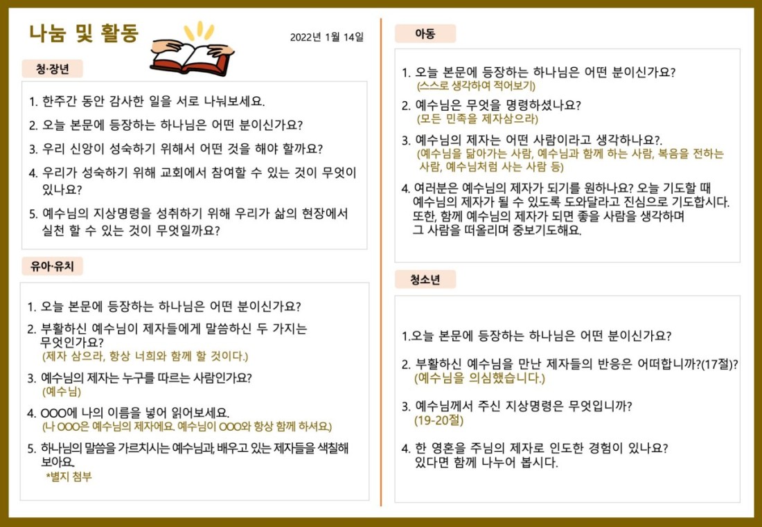2022. 1. 14. 가정예배지 페이지 정보 조회Hit 349회 작성일Date 22-01-12 21:10 본문 목록 이전글2022. 1. 21. 가정예배지 22.01.19 다음글 2022. 1. 7. 가정예배지 22.01.05