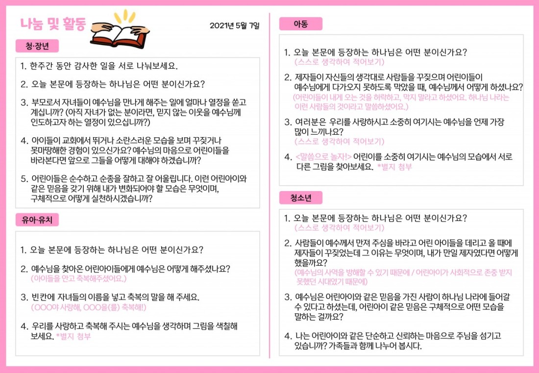 2021. 5. 7. 가정예배지 페이지 정보 조회Hit 372회 작성일Date 21-05-05 19:13 본문 목록 이전글2021. 5. 14. 가정예배지 21.05.20 다음글2021. 4. 30. 가정예배지 21.04.29