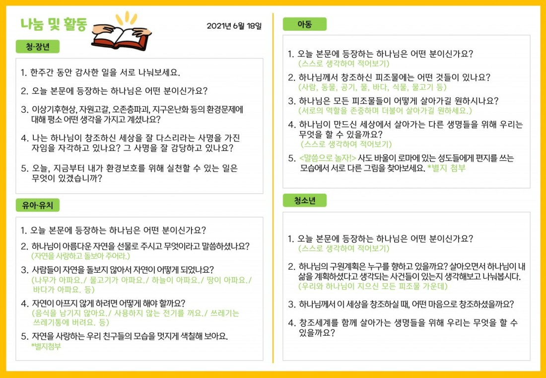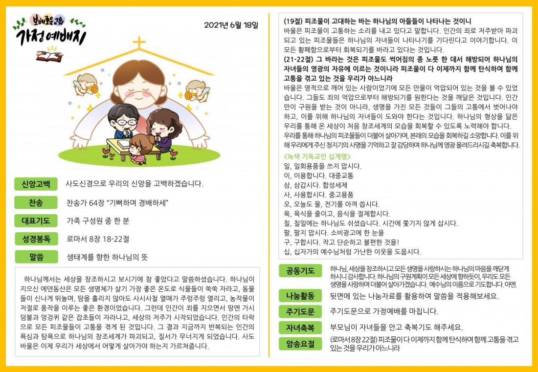 2021. 6. 18. 가정예배지 페이지 정보 조회Hit 369회 작성일Date 21-06-16 09:59 본문 목록 이전글2021. 6. 25. 가정예배지 21.06.23 다음글2021. 6. 11. 가정예배지 21.06.10