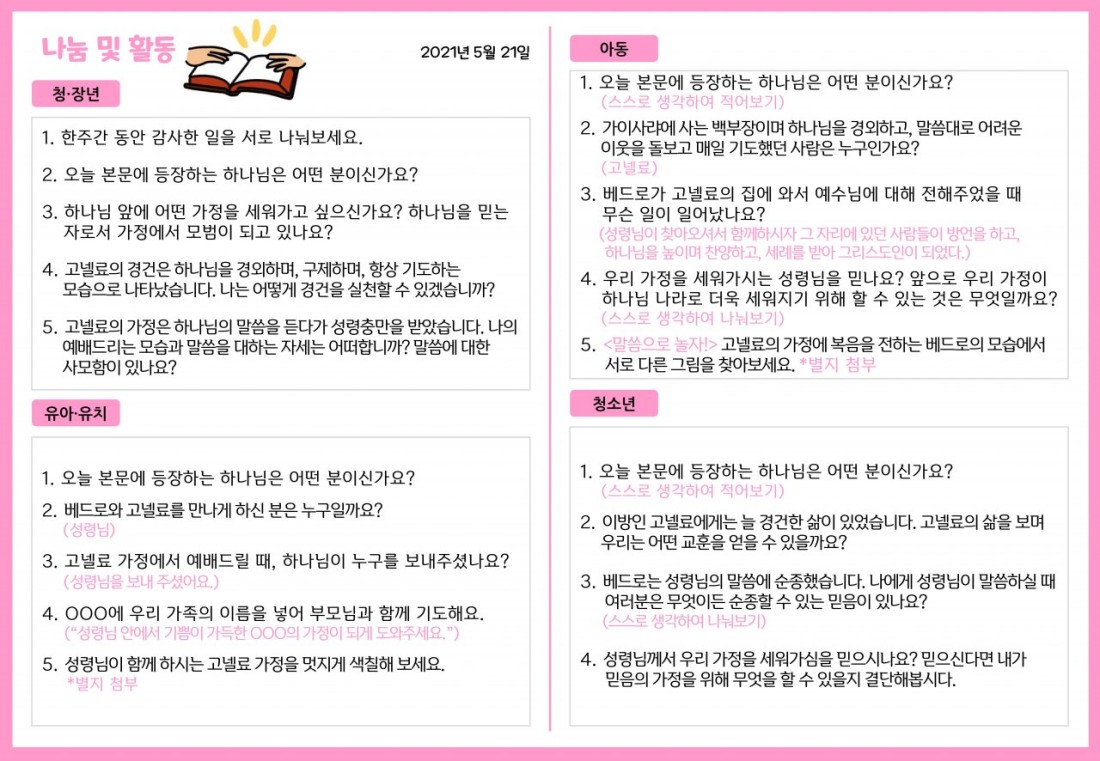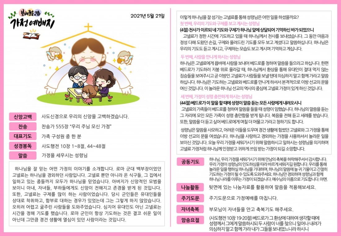 2021. 5. 21. 가정예배지 페이지 정보 조회Hit 335회 작성일Date 21-05-20 13:52 본문 목록 이전글2021. 5. 28. 가정예배지 21.05.27 다음글2021. 5. 14. 가정예배지 21.05.20