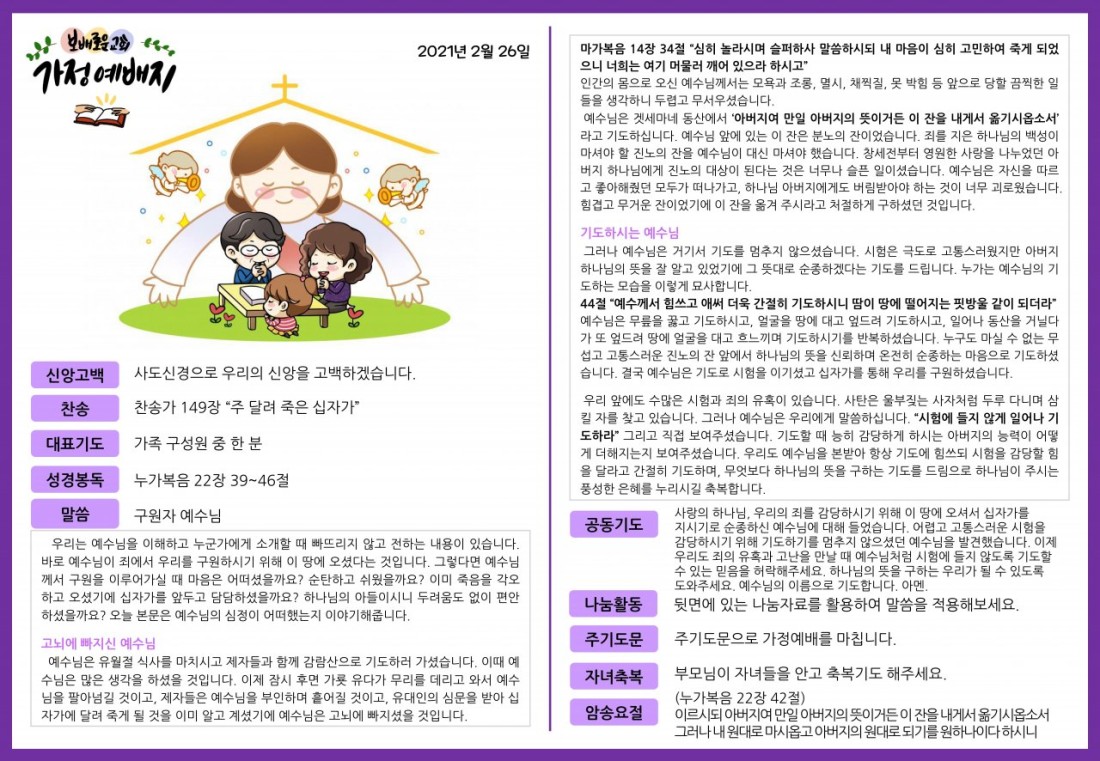 2021. 2. 26. 가정예배지 페이지 정보 조회Hit 339회 작성일Date 21-02-24 10:56 본문 목록 이전글2021. 3. 5. 가정예배지 21.03.03 다음글2021. 2. 19. 가정예배지 21.02.17