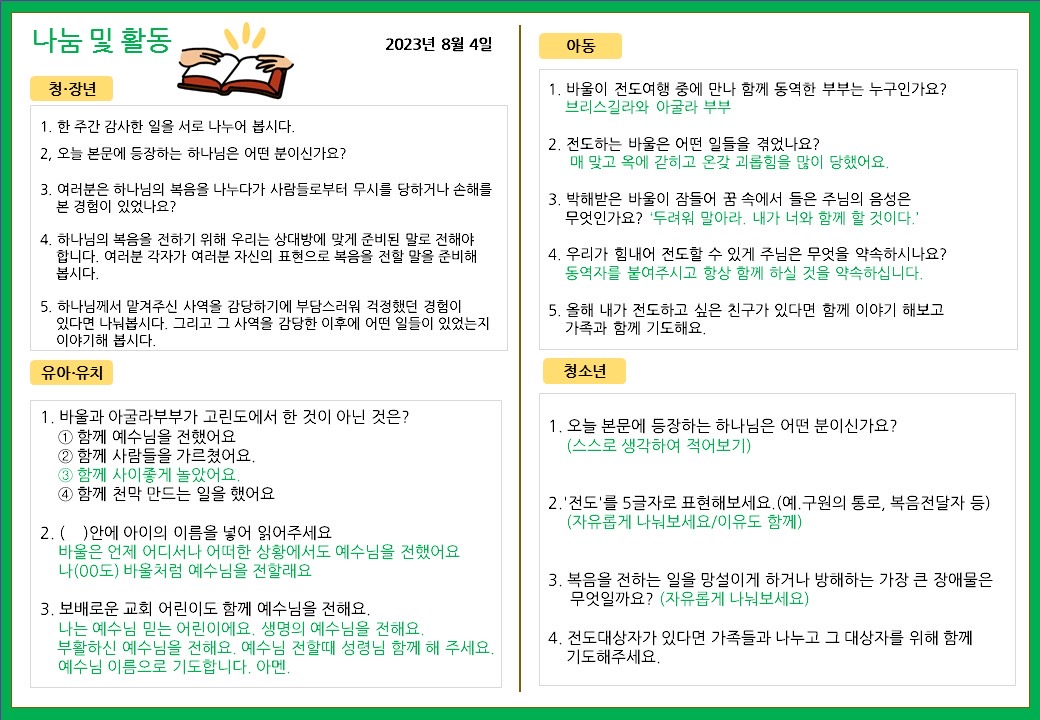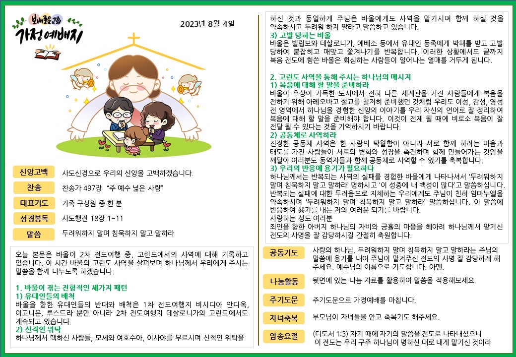 2023. 8. 4. 가정예배지 페이지 정보 조회Hit 380회 작성일Date 23-08-11 13:11 본문 목록 이전글2023. 8. 11. 가정예배지 23.08.11 다음글2023. 7. 28. 가정예배지 23.07.27