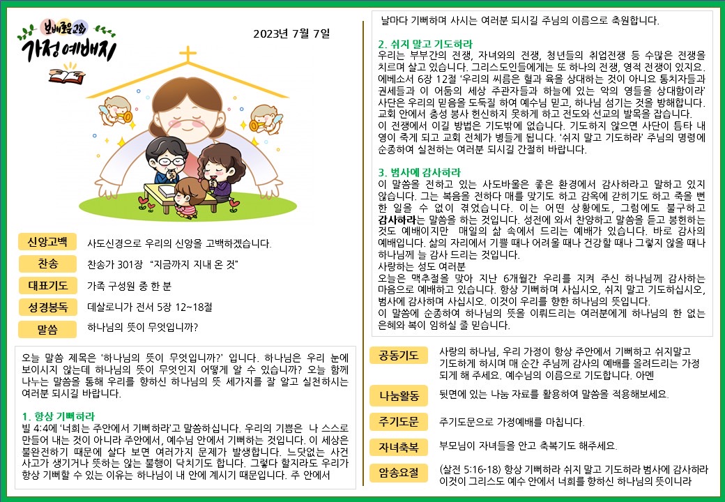 2023. 7. 7. 가정예배지 페이지 정보 조회Hit 310회 작성일Date 23-07-06 10:44 본문 목록 이전글2023. 7. 14. 가정예배지 23.07.13 다음글2023. 6. 30. 가정예배지 23.06.29