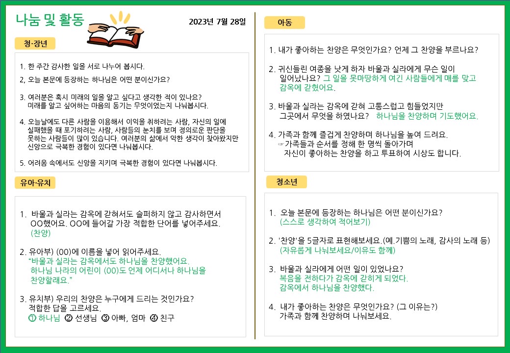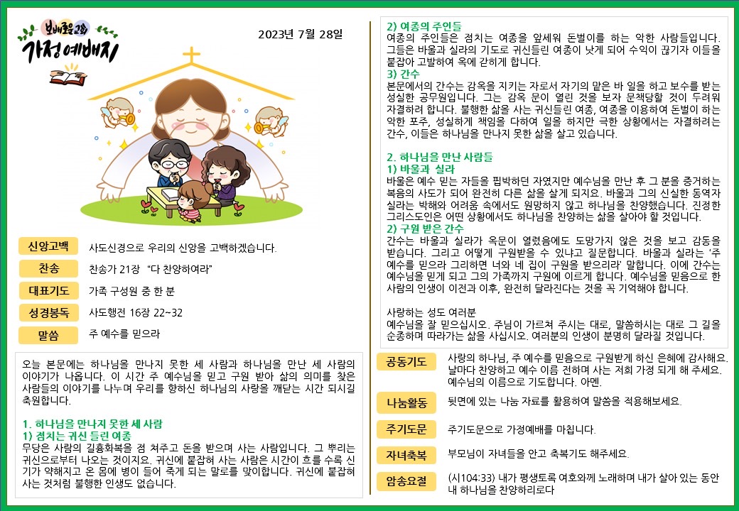 2023. 7. 28. 가정예배지 페이지 정보 조회Hit 322회 작성일Date 23-07-27 17:41 본문 목록 이전글2023. 8. 4. 가정예배지 23.08.11 다음글2023. 7. 21. 가정예배지 23.07.27