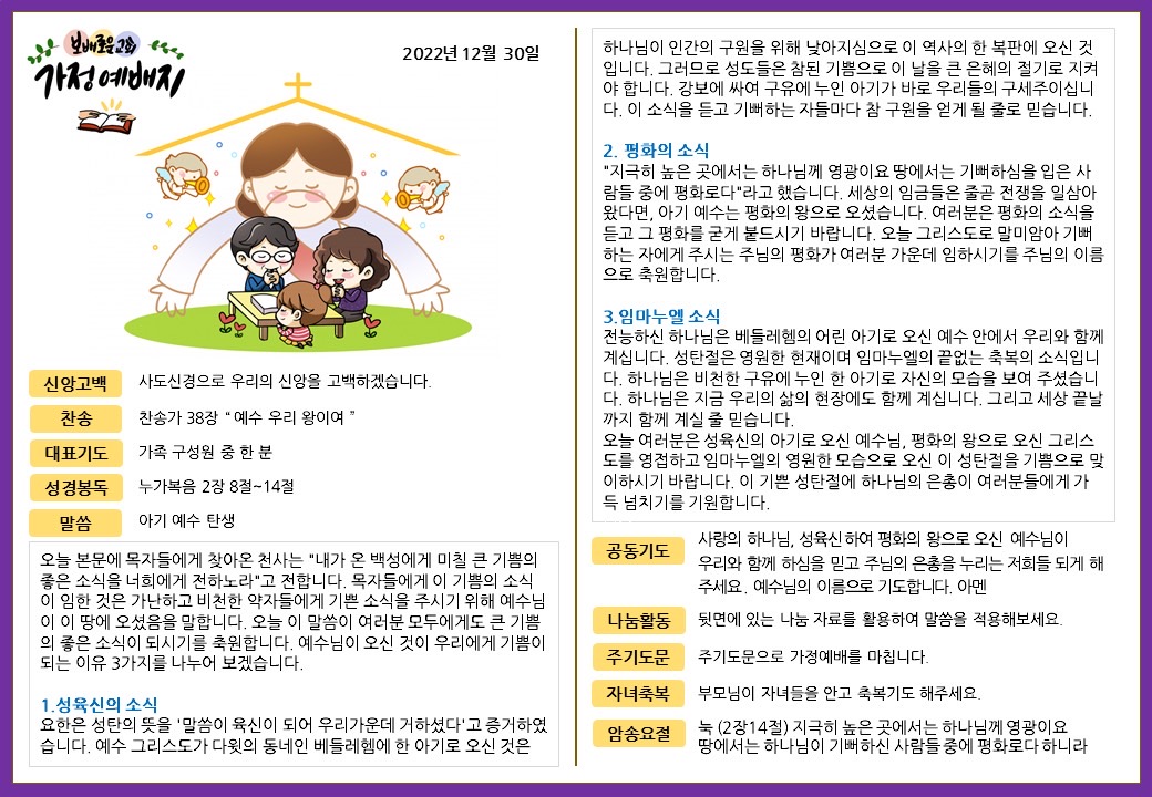 2022. 12. 30. 가정예배지 페이지 정보 조회Hit 328회 작성일Date 22-12-28 15:12 본문 목록 이전글2023. 1. 6. 가정예배지 23.01.05 다음글 2022. 12. 23. 가정예배지 22.12.28
