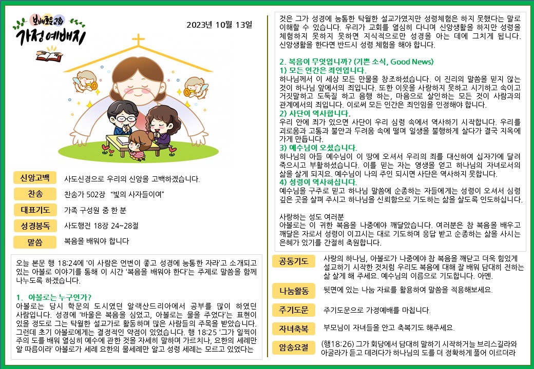 2023. 10. 13. 가정예배지 페이지 정보 조회Hit 224회 작성일Date 23-10-13 14:03 본문 목록 이전글2023. 10. 6. 가정예배지 23.10.05 다음글2023. 10. 20. 가정예배지 23.10.27