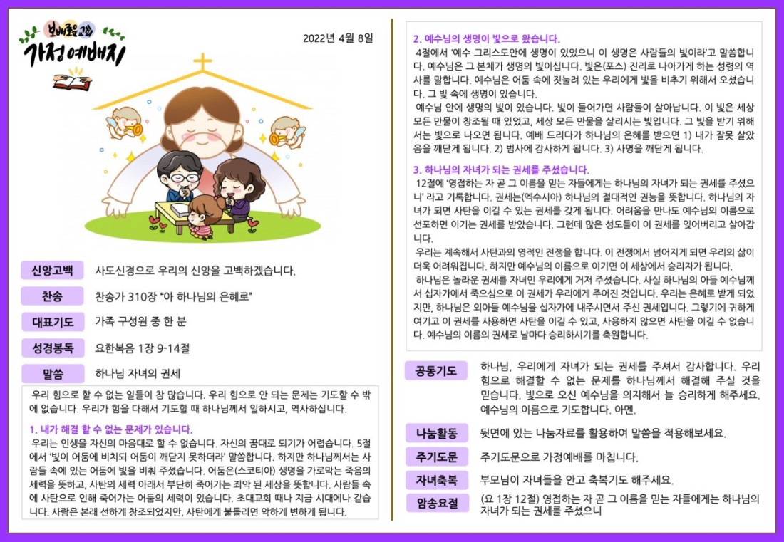 2022. 4. 8. 가정예배지 페이지 정보 조회Hit 244회 작성일Date 22-04-14 09:56 본문 목록 이전글2022. 4. 1. 가정예배지 22.03.31 다음글2022. 4. 15. 가정예배지 22.04.14