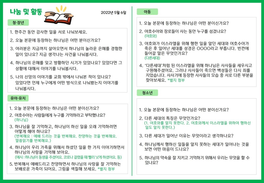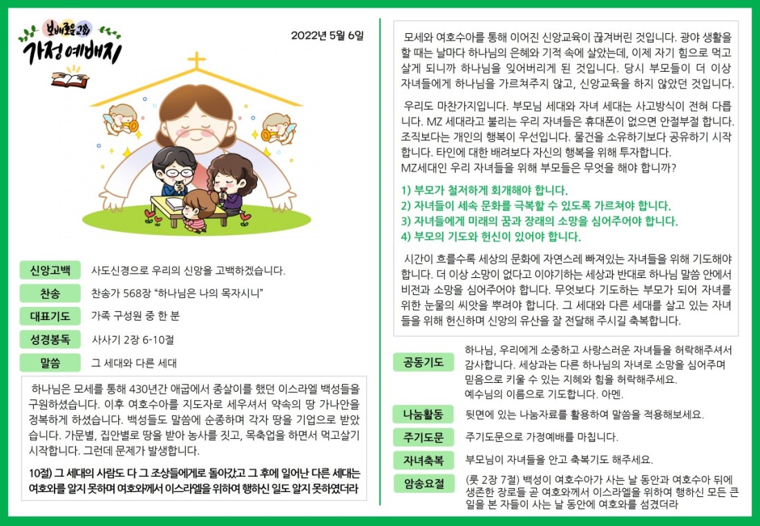 2022. 5. 6. 가정예배지 페이지 정보 조회Hit 254회 작성일Date 22-05-04 16:53 본문 목록 이전글2022. 4. 29. 가정예배지 22.04.27 다음글2022. 5. 13. 가정예배지 22.05.11