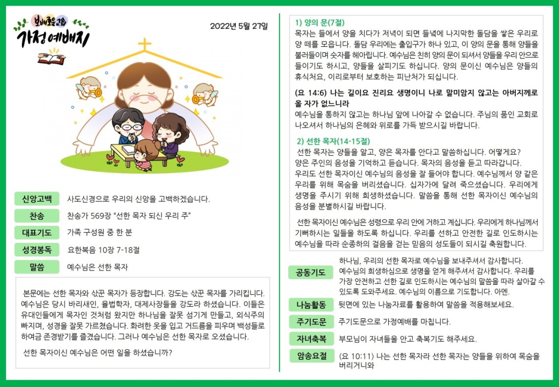 2022. 5. 27. 가정예배지 페이지 정보 조회Hit 250회 작성일Date 22-06-08 11:28 본문 목록 이전글2022. 5. 20. 가정예배지 22.05.18 다음글2022. 6. 3. 가정예배지 22.06.08