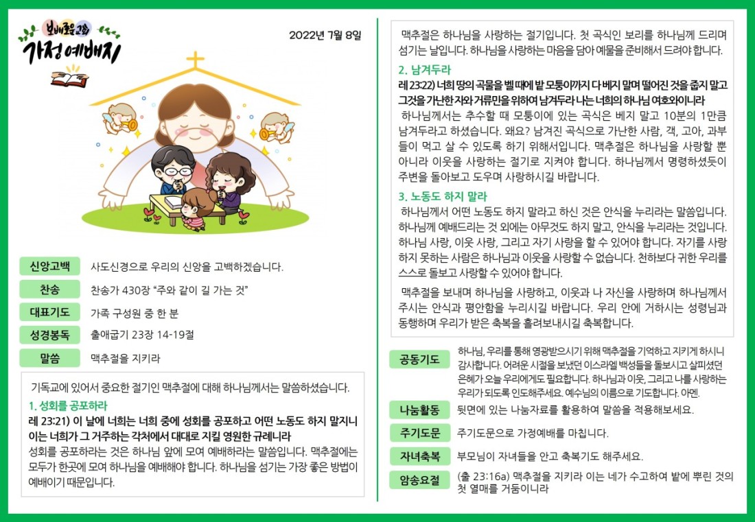 2022. 7. 8. 가정예배지 페이지 정보 조회Hit 258회 작성일Date 22-07-06 10:22 본문 목록 이전글2022. 7. 1. 가정예배지 22.06.28 다음글2022. 7. 15. 가정예배지 22.07.13