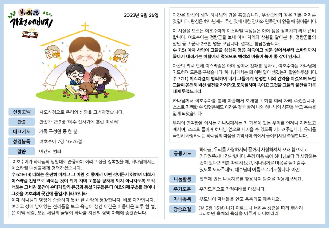 2022. 8. 26. 가정예배지 페이지 정보 조회Hit 245회 작성일Date 22-08-31 09:55 본문 목록 이전글2022. 8. 5. 가정예배지 22.08.03 다음글2022. 9. 2. 가정예배지 22.08.31