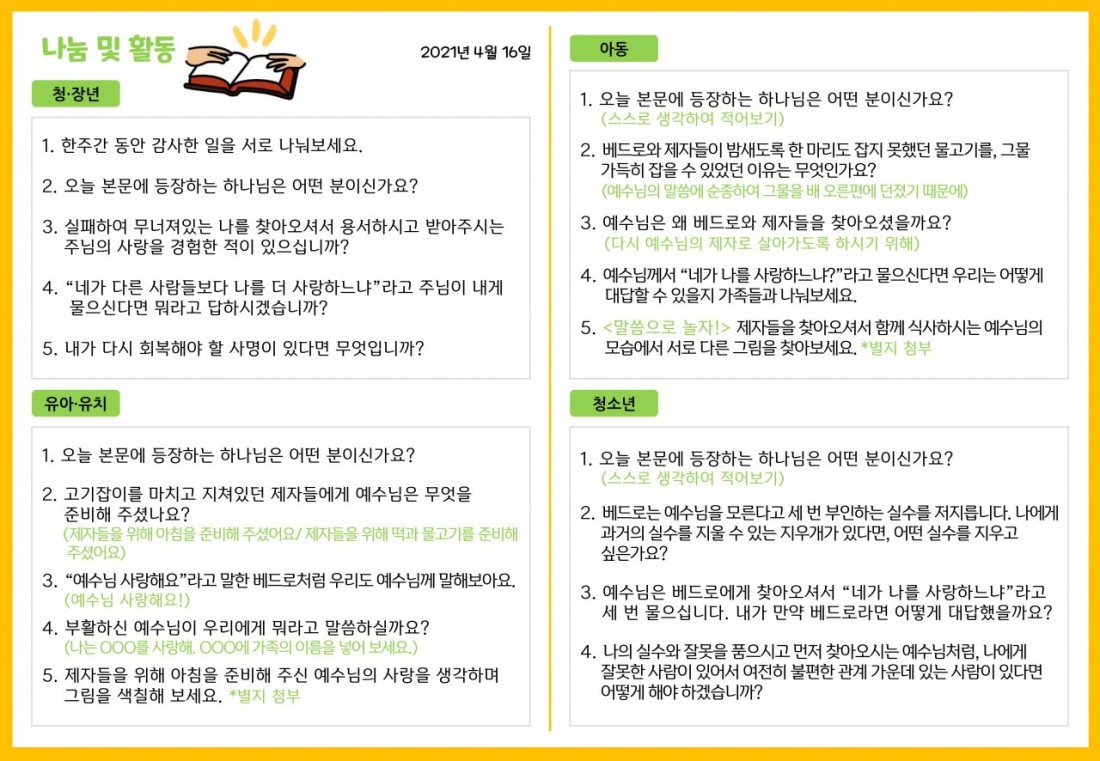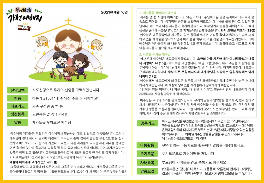 2021. 4. 16. 가정예배지 페이지 정보 조회Hit 346회 작성일Date 21-04-14 17:56 본문 목록 이전글2021. 4. 9. 가정예배지 21.04.07 다음글2021. 4. 23. 가정예배지 21.04.21