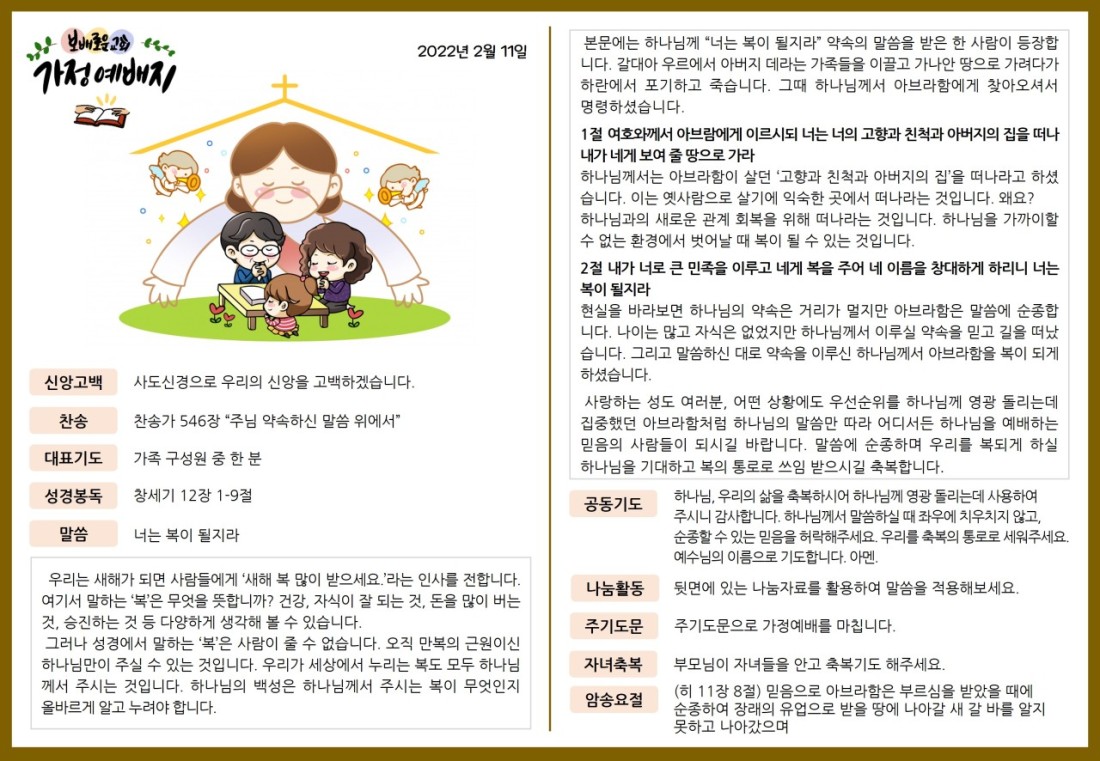 2022.2. 11. 가정예배지 페이지 정보 조회Hit 331회 작성일Date 22-02-23 16:39 본문 목록 이전글2022. 1. 21. 가정예배지 22.01.19 다음글 2022. 2. 18. 가정예배지 22.02.23