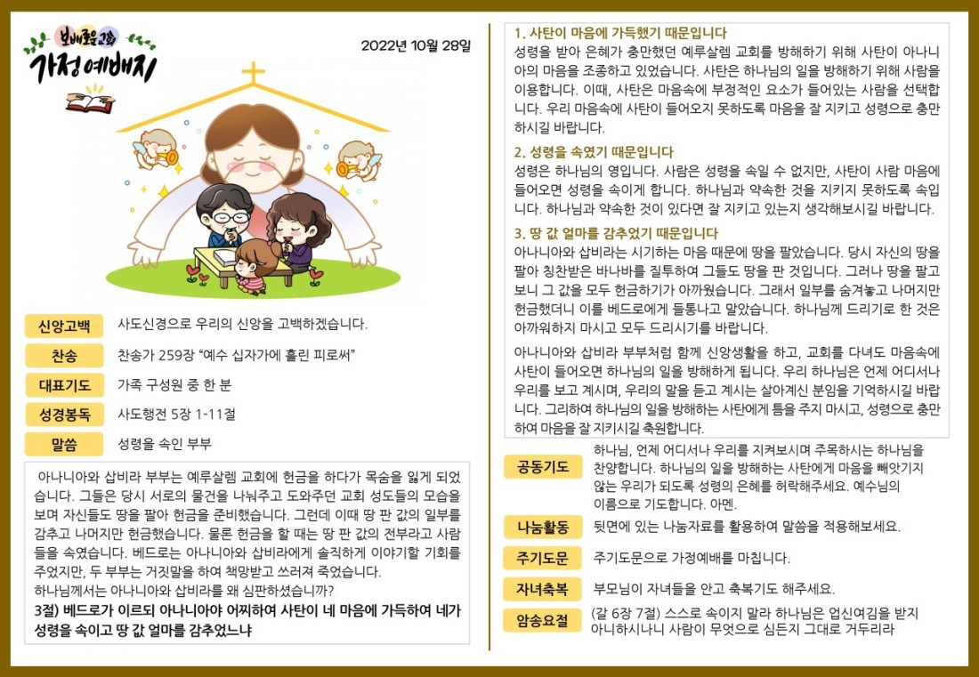 2022. 10. 28. 가정예배지 페이지 정보 조회Hit 252회 작성일Date 22-12-28 15:07 본문 목록 이전글2022. 11. 4. 가정예배지 22.12.28 다음글 2022. 10. 21. 가정예배지 22.12.28