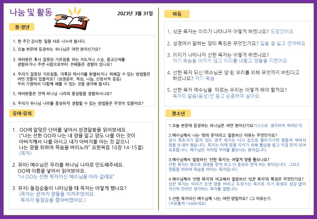 2023. 3. 31. 가정예배지 페이지 정보 조회Hit 225회 작성일Date 23-03-30 17:16 본문 목록 이전글2023. 4. 7. 가정예배지 23.04.06 다음글2023. 3. 24. 가정예배지 23.03.22
