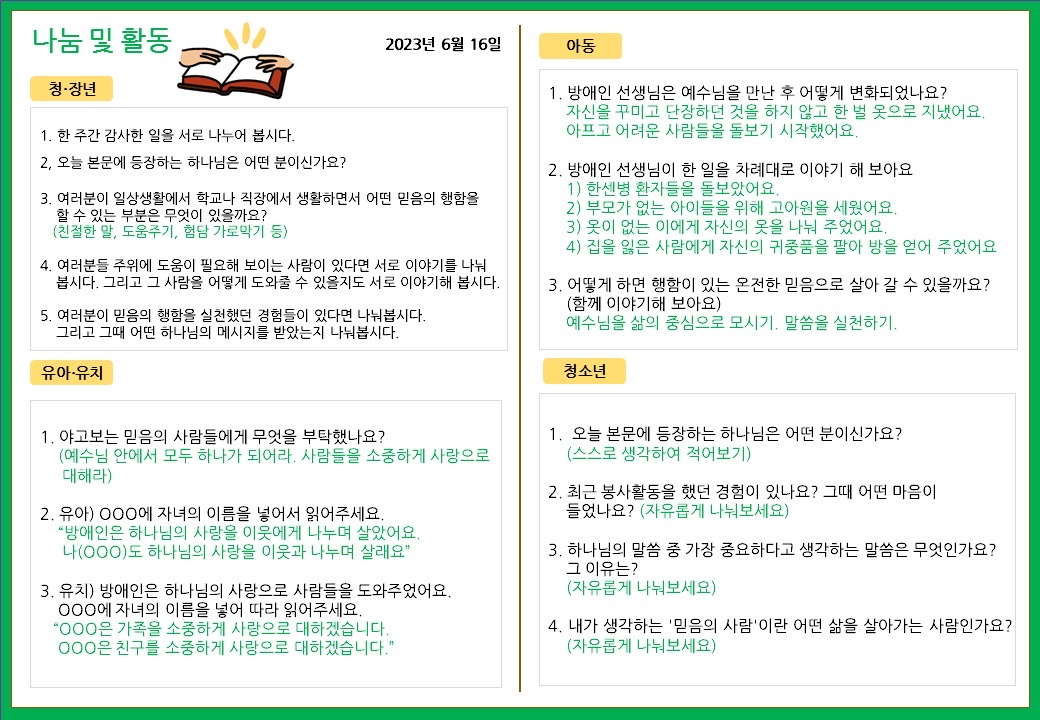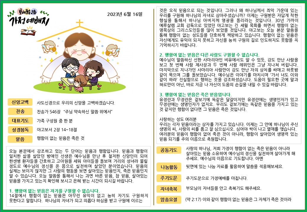 2023. 6. 16. 가정예배지 페이지 정보 조회Hit 251회 작성일Date 23-06-21 16:15 본문 목록 이전글2023. 6. 23. 가정예배지 23.06.21 다음글2023. 6. 9. 가정예배지 23.06.09