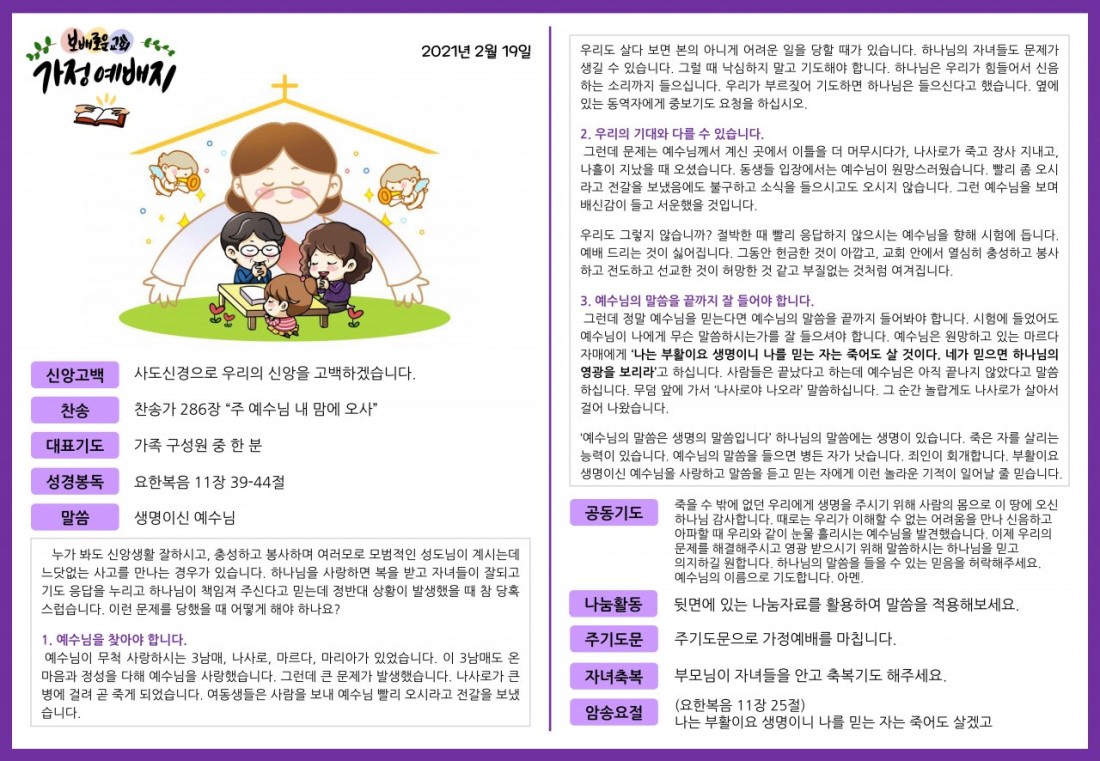 2021. 2. 19. 가정예배지 페이지 정보 조회Hit 294회 작성일Date 21-02-17 10:22 본문 목록 이전글2021. 2. 12. 가정예배지 21.02.10 다음글2021. 2. 26. 가정예배지 21.02.24
