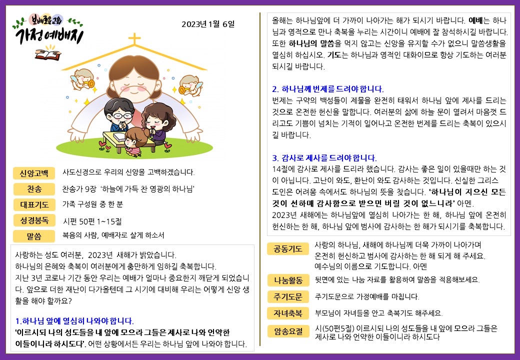 2023. 1. 6. 가정예배지 페이지 정보 조회Hit 230회 작성일Date 23-01-05 11:02 본문 목록 이전글 2022. 12. 30. 가정예배지 22.12.28 다음글2023. 1. 13. 가정예배지 23.01.12
