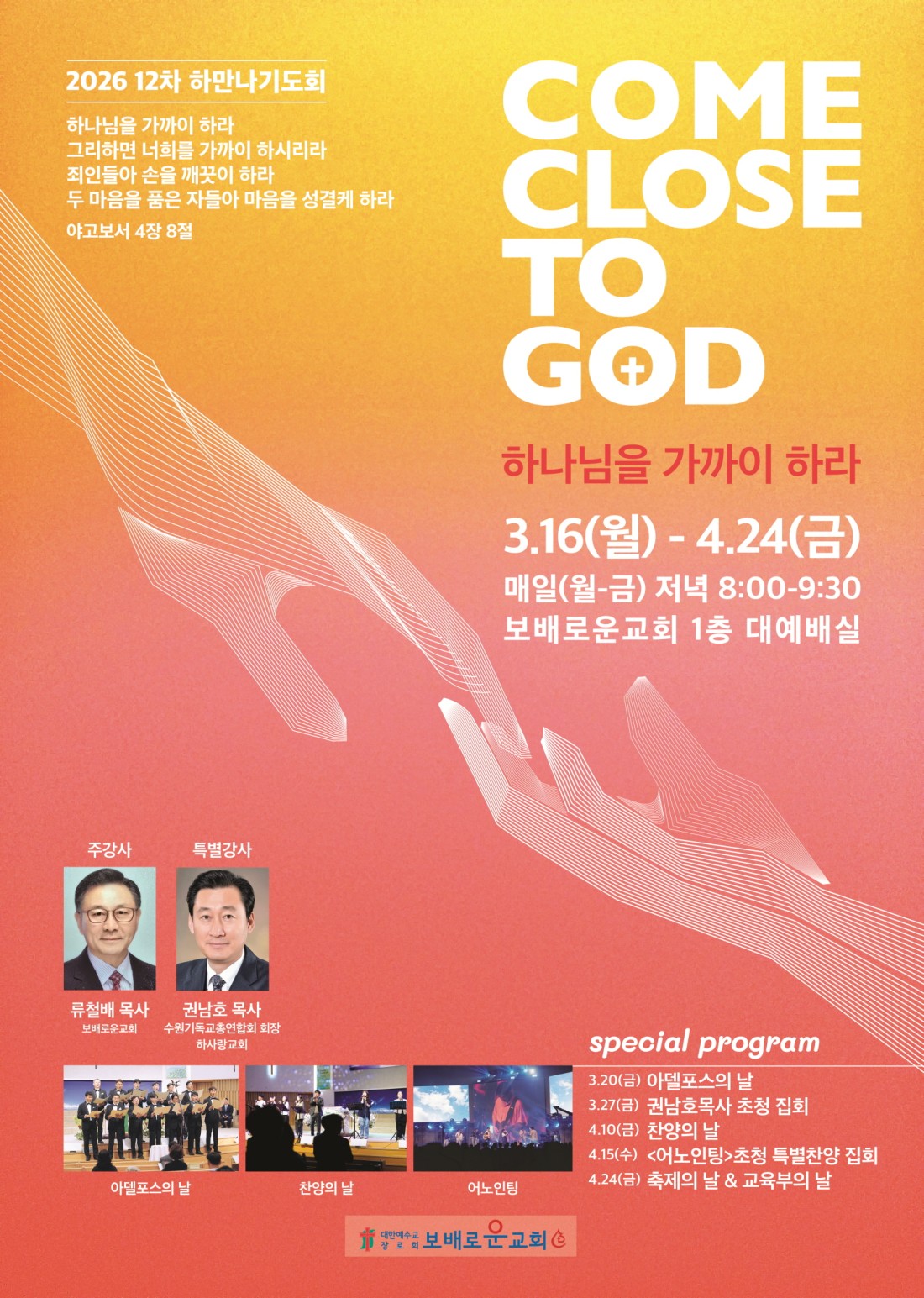 알림 2026 제 12차 하만나 페이지 정보 본문 하만나에 많이 참여해주세요^^ 목록 이전 이벤트'야고보서' 말씀 사경회 26.02.20 다음 이벤트기독학부모교실 스텝 모집 26.02.07